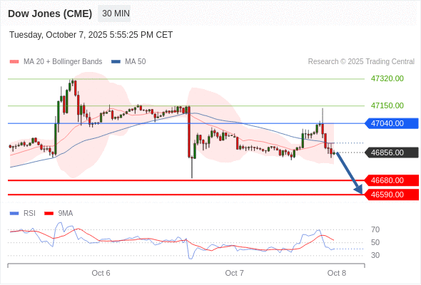 交易策略: 在 47040.00 之下,看跌,目标价位为 46680.00 ,然后为 46590.00 。