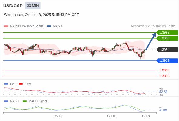 美元/加元 当日内 : 看涨。