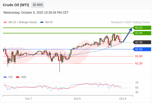 在 62.00 之上,看涨,目标价位为 62.90 ,然后为 63.20 。