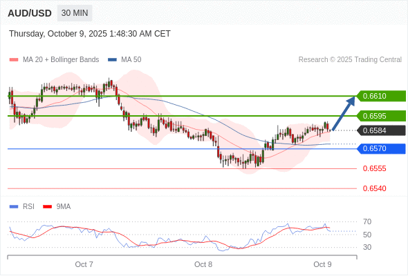 在 0.6570 之上,看涨,目标价位为 0.6595 ,然后为 0.6610 。