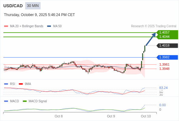 美元/加元 当日内 : RSI是超买的