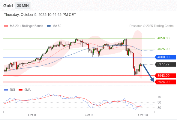 在 4000.00 之下,看跌,目标价位为 3943.00 ,然后为 3924.00 。