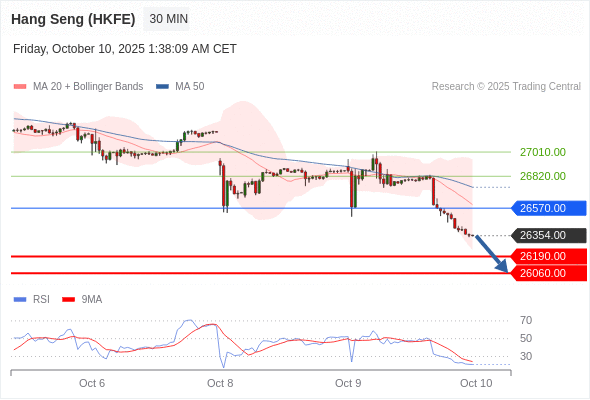 香港恒生指数期货 当日内: 下跌趋势。