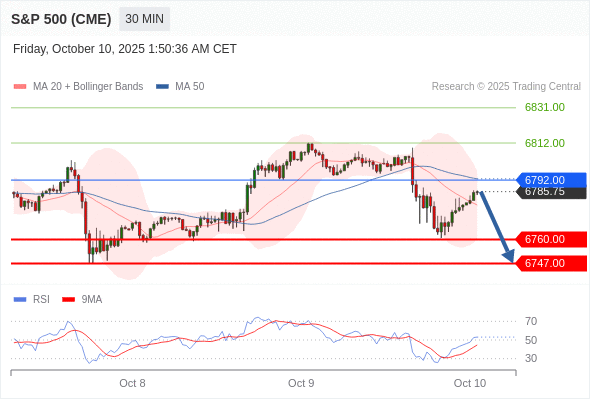 美国标普500指数期货 (Z5) 当日内: 短期关键阻力位在6792.00。