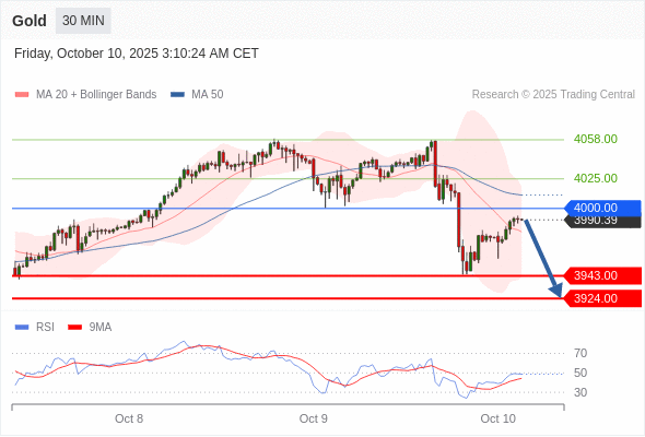 在 4000.00 之下,看跌,目标价位为 3943.00 ,然后为 3924.00 。