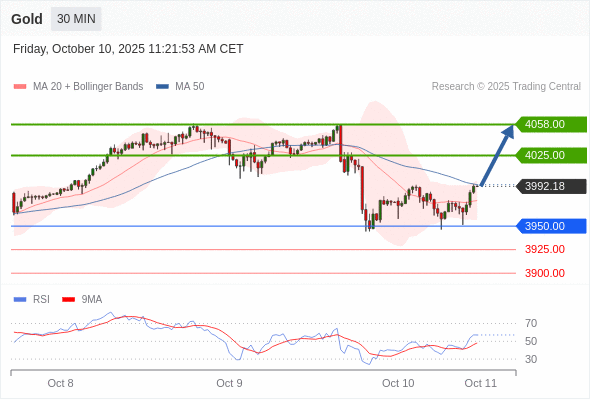 在 3950.00 之上,看涨,目标价位为 4025.00 ,然后为 4058.00 。