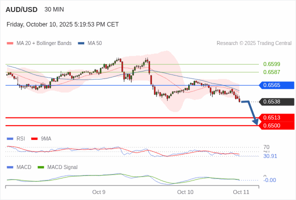 澳元/美元 当日内 : 看跌,在 0.6565 之下。
