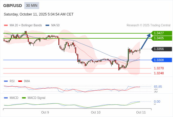 英镑/美元 当日内 : 看涨,当 1.3308 为支撑位。