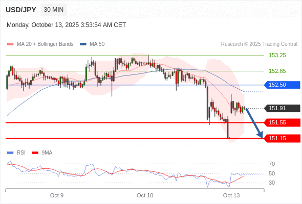 在 152.50 之下,看跌,目标价位为 151.55 ,然后为 151.15 。