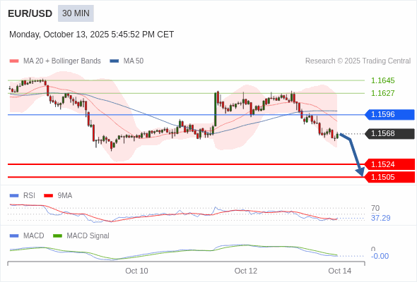 欧元/美元 当日内 : 看跌,在 1.1596 之下。