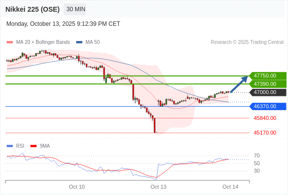 在 46370.00 之上,看涨,目标价位为 47390.00 ,然后为 47750.00 。