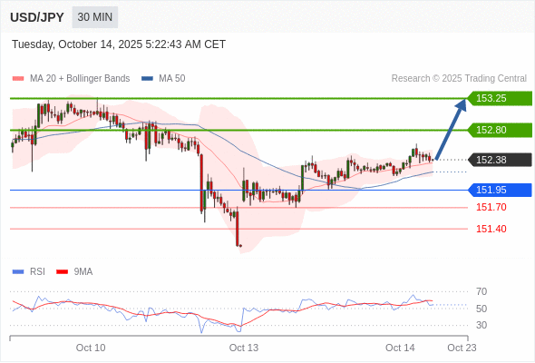 在 151.95 之上,看涨,目标价位为 152.80 ,然后为 153.25 。