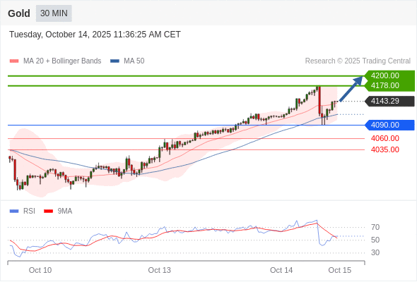 在 4090.00 之上,看涨,目标价位为 4178.00 ,然后为 4200.00 。