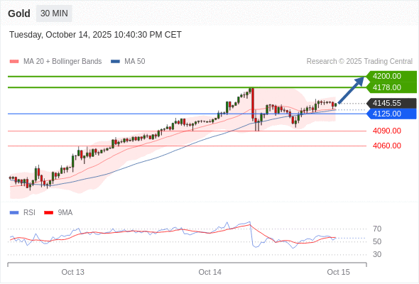 在 4125.00 之上,看涨,目标价位为 4178.00 ,然后为 4200.00 。