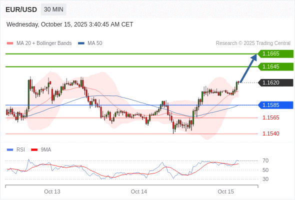在 1.1585 之上,看涨,目标价位为 1.1645 ,然后为 1.1665 。
