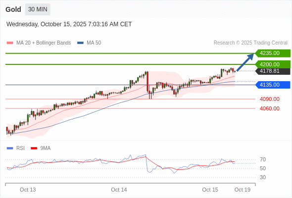 在 4135.00 之上,看涨,目标价位为 4200.00 ,然后为 4235.00 。