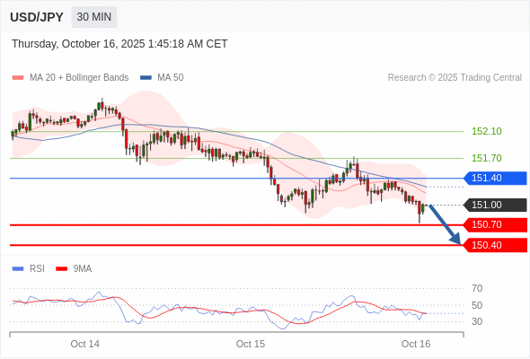 在 151.40 之下,看跌,目标价位为 150.70 ,然后为 150.40 。