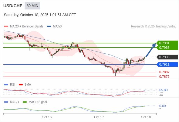 美元/瑞郎 当日内 : 看涨,当 0.7911 为支撑位。