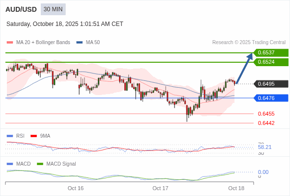 澳元/美元 当日内 : 看涨,当 0.6476 为支撑位。