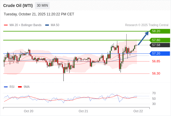 在 57.20 之上,看涨,目标价位为 57.80 ,然后为 58.20 。