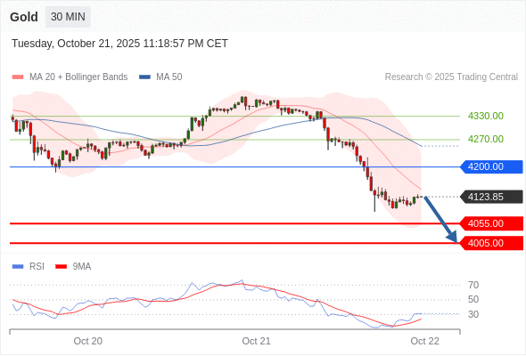 在 4200.00 之下,看跌,目标价位为 4055.00 ,然后为 4005.00 。