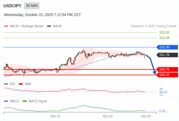 美元/日元 当日内 : 看跌,当 152.30 为阻力位。
