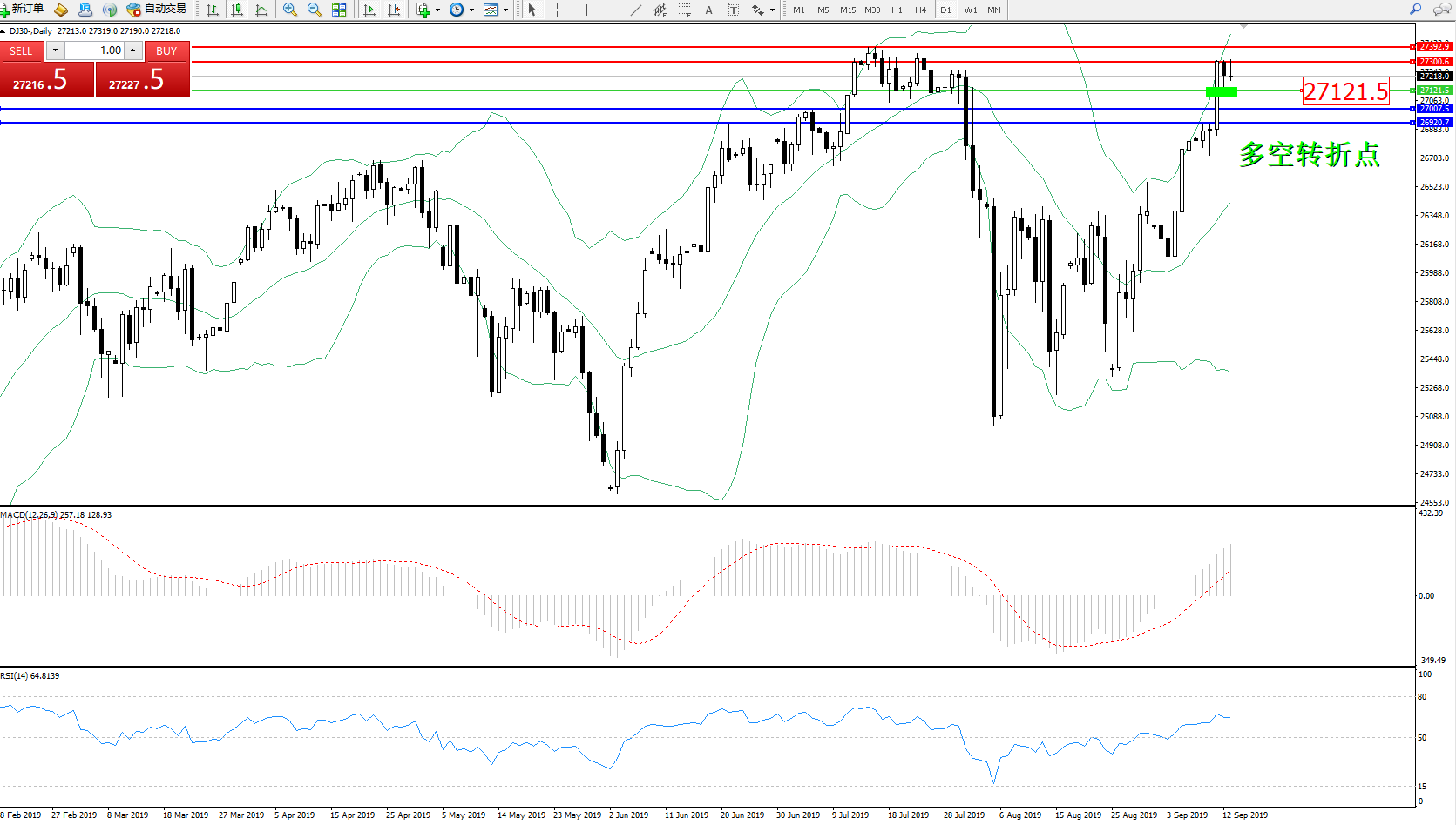 道琼斯指数9月13日(周五)收盘上涨36.90点,涨幅0.14%,报27219.38点。道指录得连续第8日上涨,美国8月零售销售增幅超出预期。投资者仍在关注国际贸易局势的发展及全球央行的宽松政策前景。不过,经济指标的改善不太可能影响美联储下周开会时降息。美国10年期国债收益率一度升高13个基点至1.90%附近,是8月2日以来最高,因大宗商品交易顾问和房地产投资信托基金抛售国债;然而,实钱和央行买入5年期国债。