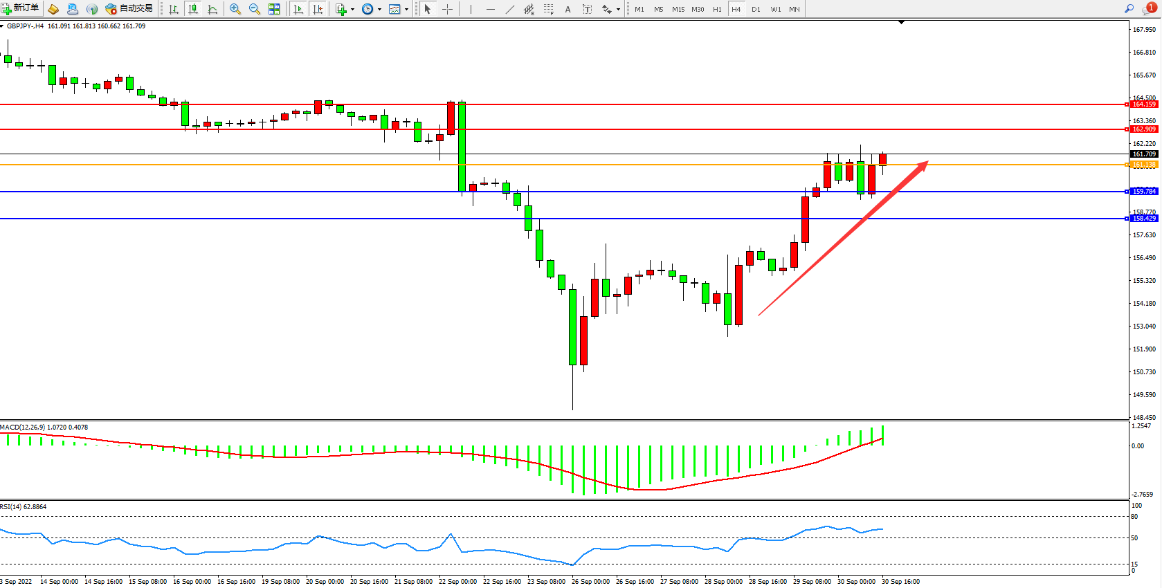 4小时图看:低位多头动力维持震荡上移,短期有继续向上移动迹象,MACD指标处于多头区域维持整理上行,RSI指标处于50均衡线上側弱势整理;