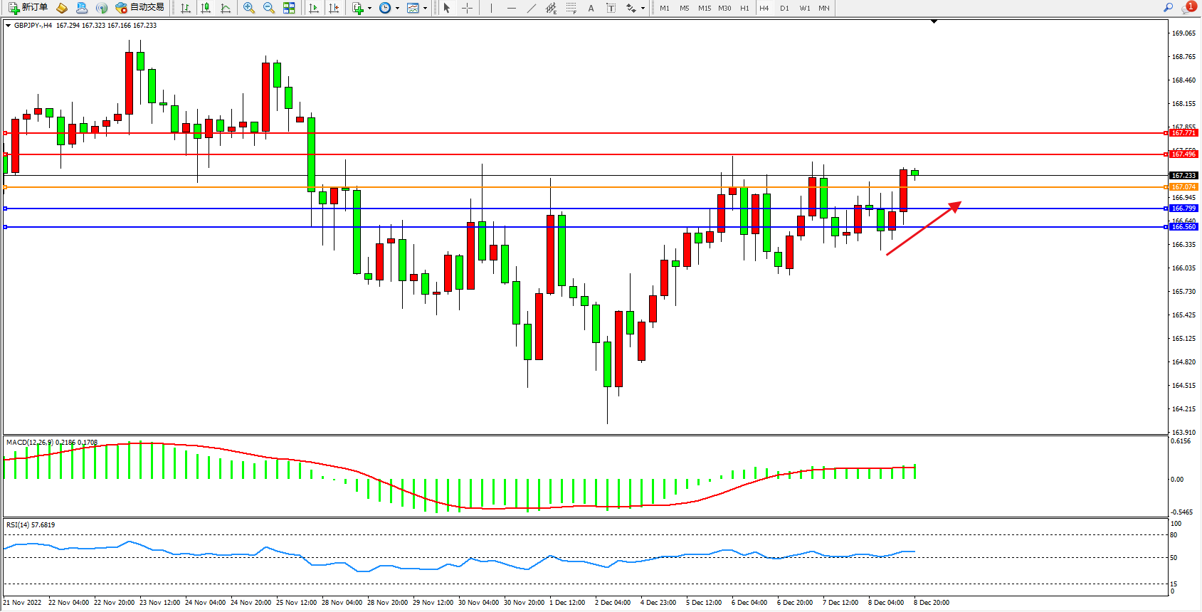 英镑兑日圆维持167.233附近震荡,货币市场目前显示,英国银行利率到2023年5月将为4.5%,并有50%的可能在2023年8月达到4.75%。如果英国央行采取强硬立场,明年将利率提高到4.75%或更高。