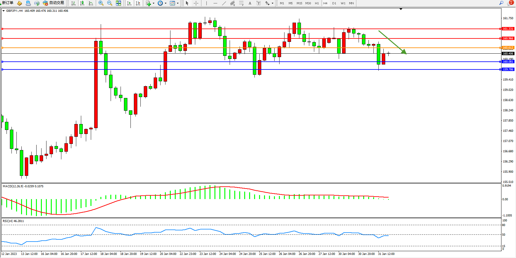 英镑兑日圆维持160.406附近震荡,MF预计今年英国经济将萎缩0.6%,与此前预测的增长0.3%相比大幅下降。英国将受一系列因素的影响,包括其财政大臣亨特去年年底宣布的增税,他当时试图在前首相特拉斯公布的“迷你预算”引发动荡后恢复投资者的信心。