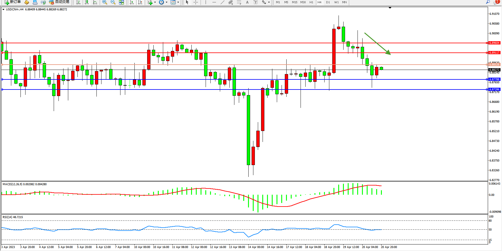 美元人民币USDCNH——4小时K线图显示: