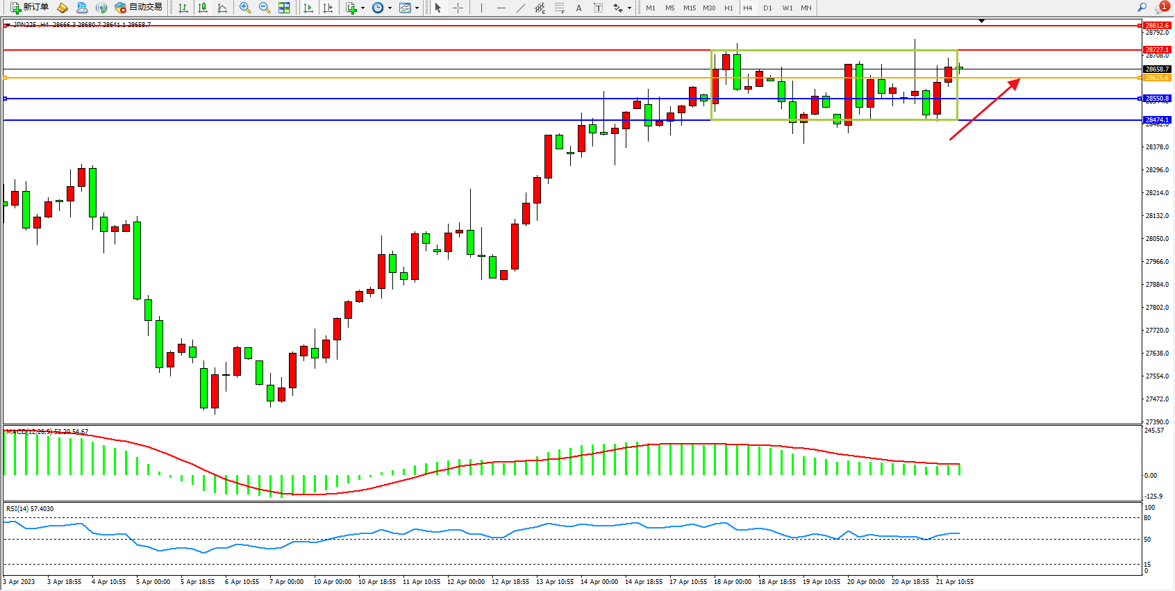 4小时图看:高位短期维持矩形区间震荡走势中,市场多头动力伺机再度向上突破迹象,MACD指标处于0轴线上側徘徊,RSI指标处于50均衡线上側弱势整理;