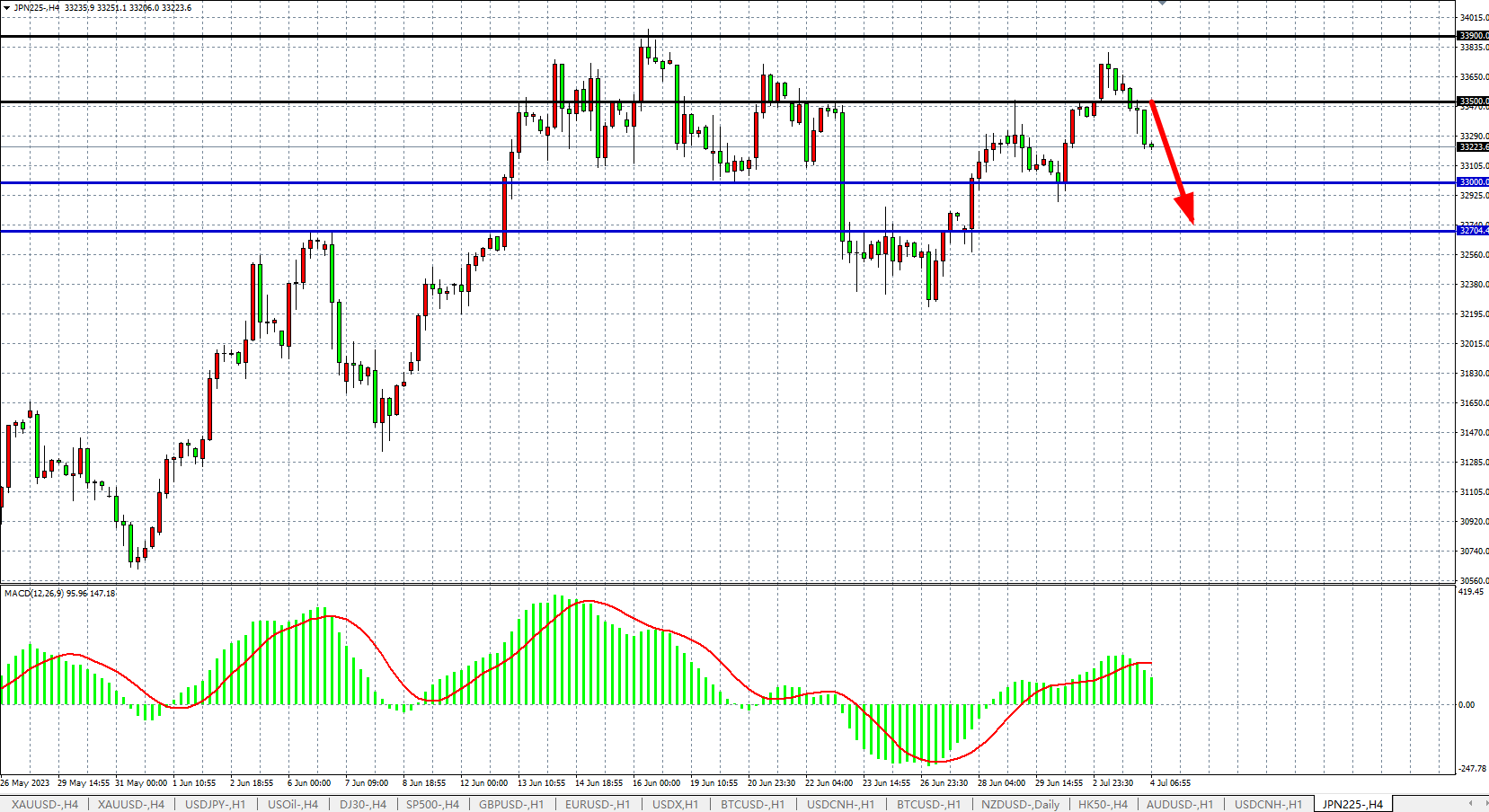 周二(7月4日)收盘下跌353.33点,跌幅1.05%,报33400.00点