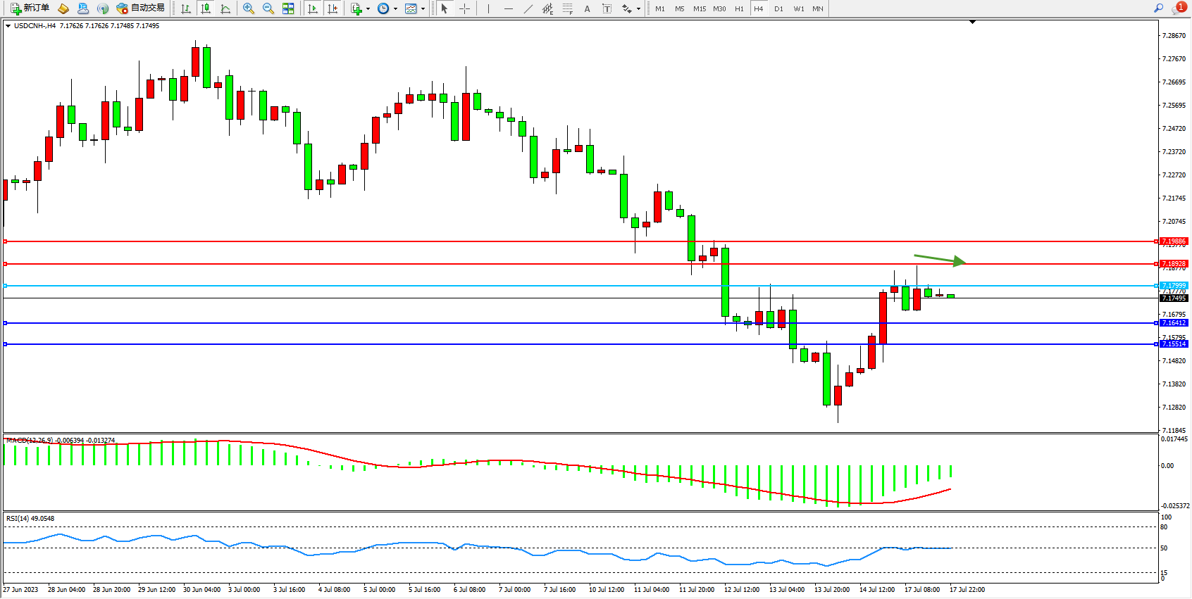 备选策略:7.17999上方看涨,目标7.18928 7.19886