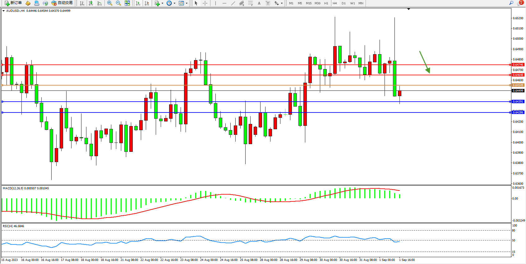 交易策略:0.64549下方看跌,目标0.64391  0.64286