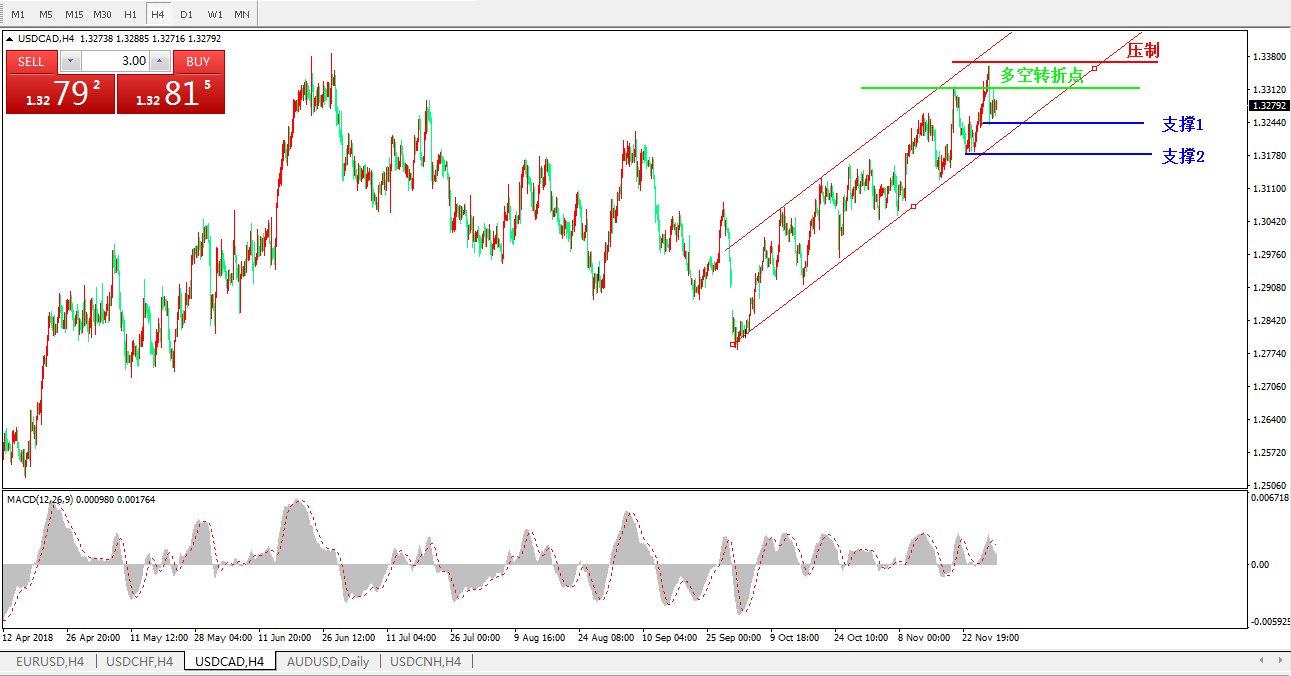技术面简析:上攻态势受MACD3顶背离限制,汇价有望回测通道下轨。重点警惕汇价是否会快速击穿下轨。
