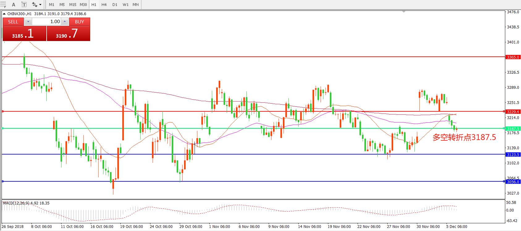 1小时图看,CHINA300中华指数跳空低开后持续下行,整体价位跌至均线系统之下,MACD红柱缩短,日内走势以弱势震荡为主。