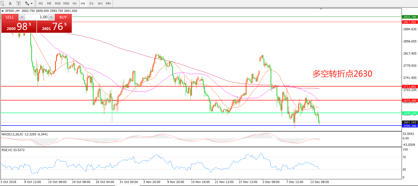 4小时图看,标普500触碰2670阻力后回落,击穿2630转折点后再次考验2590支撑,整体价格位于均线系统之下, MACD绿柱增加,RSI掉头向下,短期震荡回落风险较大。