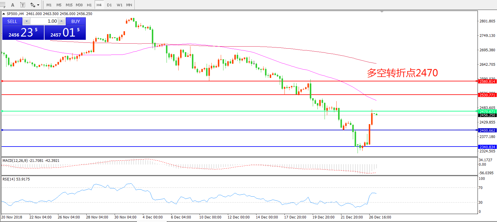 4小时图看,SP500触碰2340支撑后大幅反弹, MACD绿柱缩短,RSI指标出现拐头,短期震荡走势概率较大。