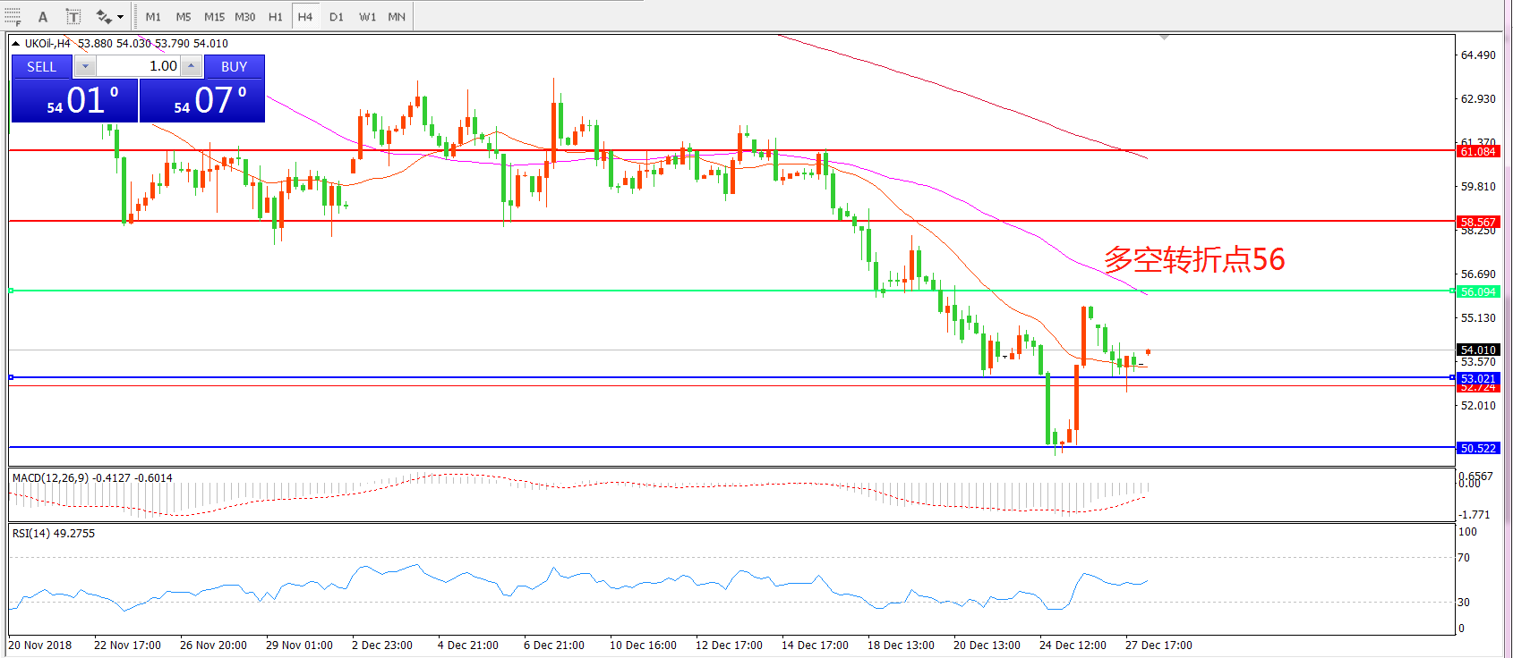 4小时图看,油价触及50美金后出现反弹,均线系统仍呈空头排列,MACD绿柱缩短,短期走势呈现回落震荡的概率较大。
