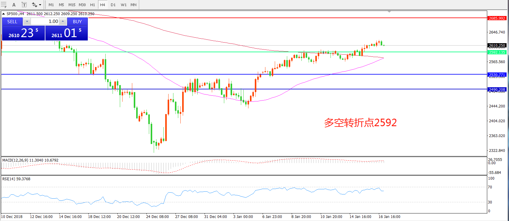 4小时图看,SP500近期逐渐站稳200周期均线,短期55均线有拐头上升迹象,MACD红柱缩短,小幅反弹成为可能。