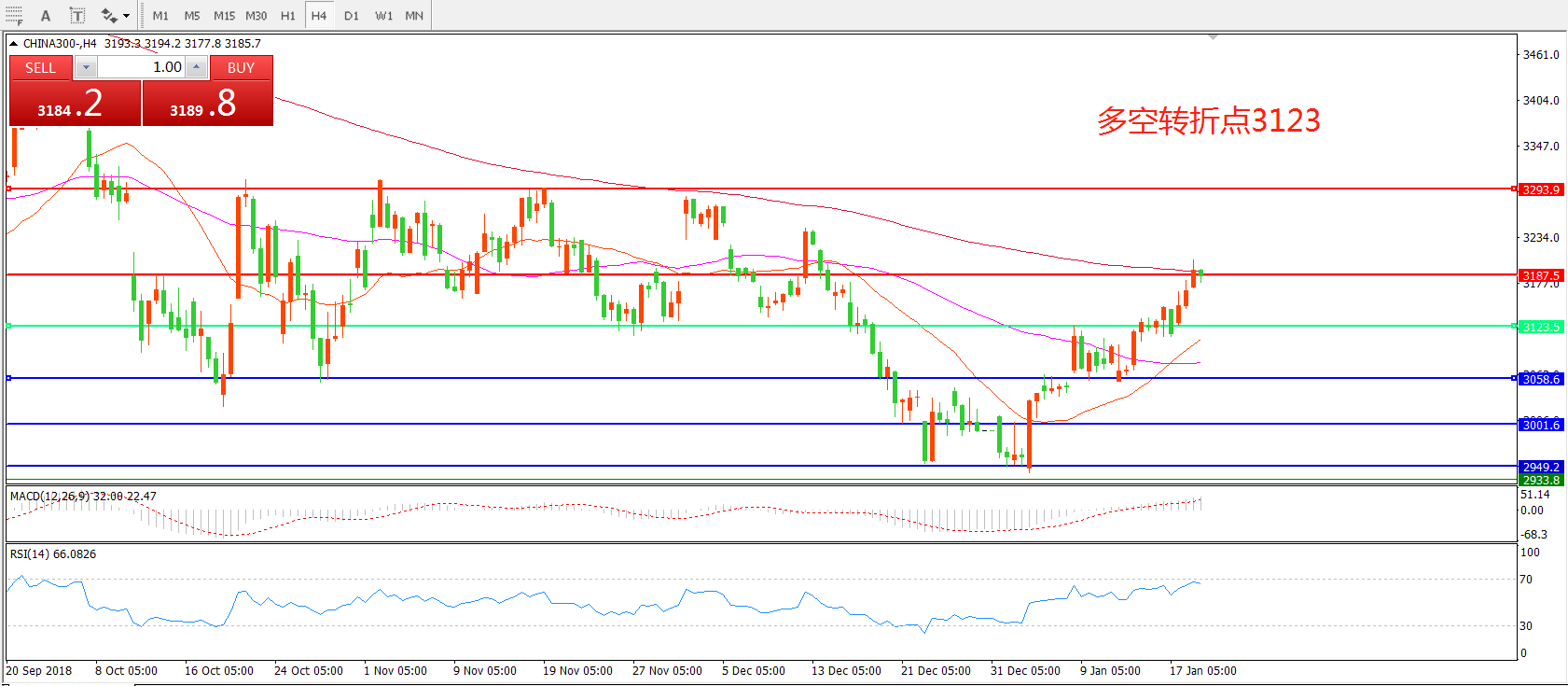 4小时图看,CHINA300中华指数站稳3058后陷入整理,日内如能站稳3123一线,反弹趋势即可确立, MACD绿柱减少,红柱增加,短期反弹成为可能。