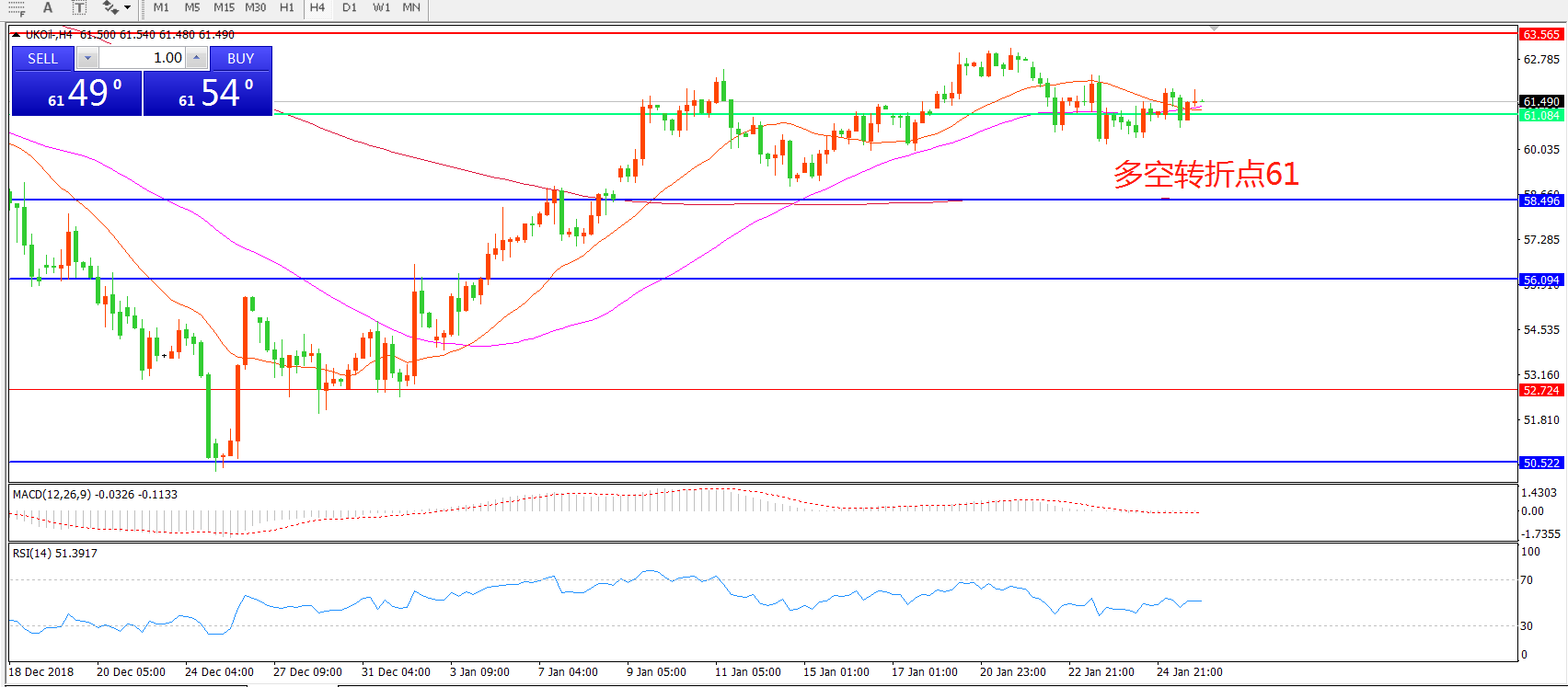 4小时图看,油价经过连续整理站稳61美元,短期整理后受制于63美元关口, 呈现区间震荡形态,均线系统逐渐走平, MACD红柱减少,回落61附近后做多为合理选择。