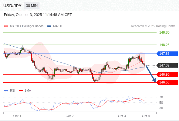 在 147.85 之下,看跌,目标价位为 146.90 ,然后为 146.55 。