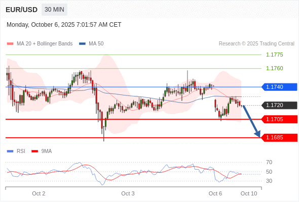 在 1.1740 之下,看跌,目标价位为 1.1705 ,然后为 1.1685 。
