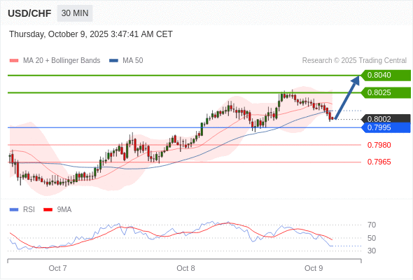 在 0.7995 之上,看涨,目标价位为 0.8025 ,然后为 0.8040 。